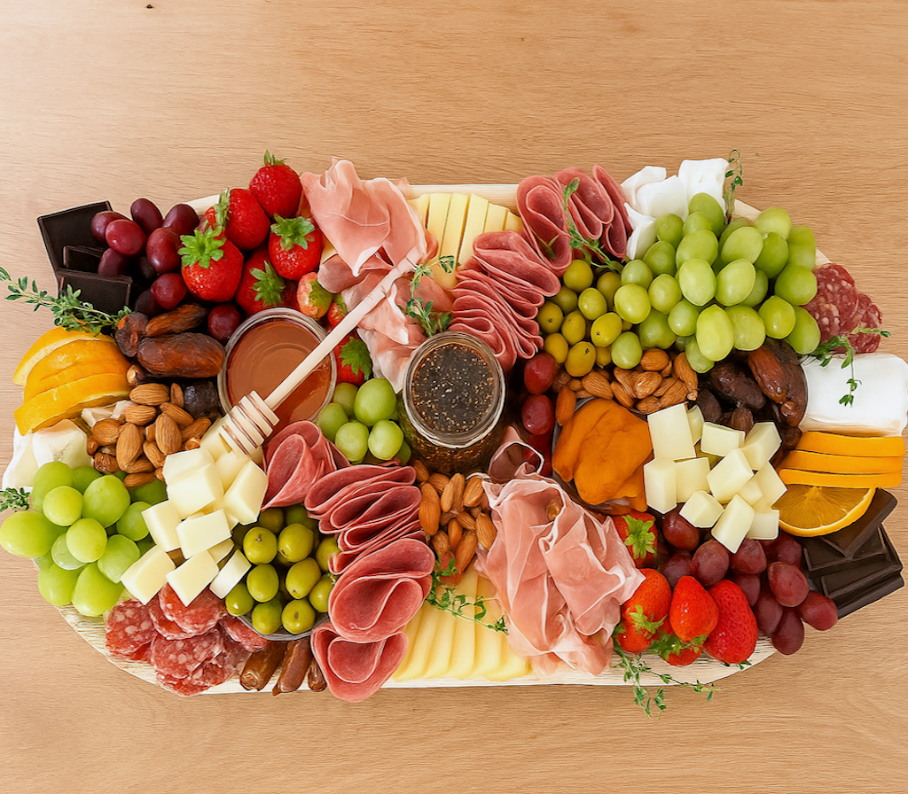 This Delightful board includes truffle cheese, gruyere, brie, muenster, goat cheese, saucisson sec, soppressata, salami, prosciutto, fresh grapes, strawberries, orange, olives, dates, chocolate bar, sweet cherry peppers, honey and fig spread.